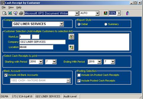 This is a report that shows a list of the cash receipts that have been entered against a specific period of time. It shows posted an/or un-posted items, if so desired, and shows detail information of the receipt, such as company name, invoice number being affected and amount among others.